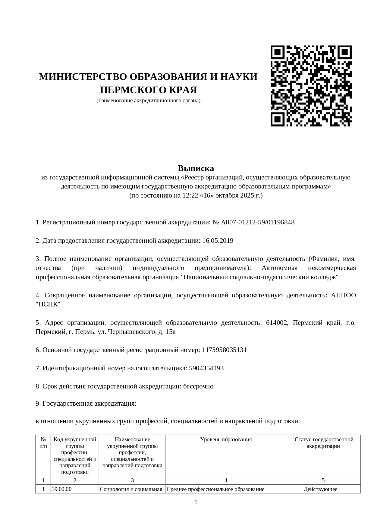 • Свидетельства о бессрочной государственной аккредитации выданной Министерством образования и науки Пермского края